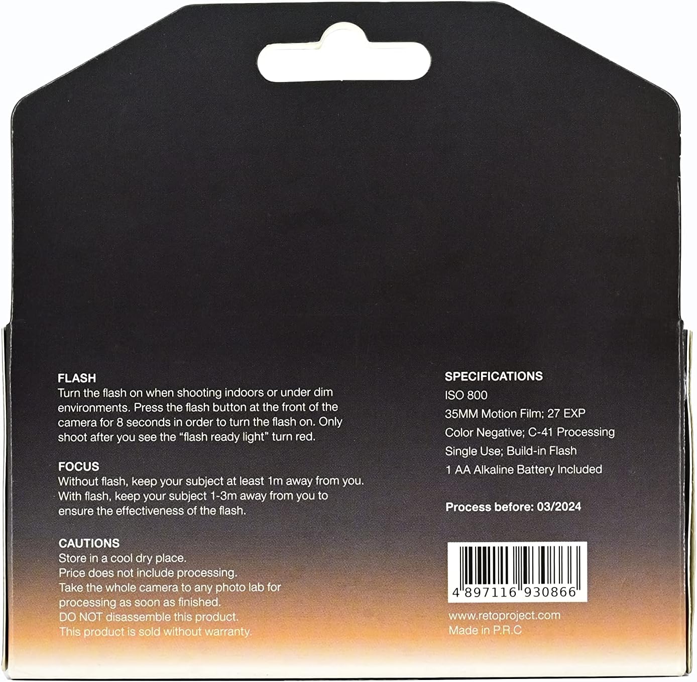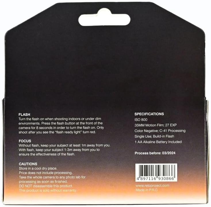 Featuring a focus-free design, the RETO Amber Tungsten camera ensures that your shots are sharp and clear without the hassle of adjusting focus settings. The built-in flash enhances your photos in low-light conditions, allowing you to capture stunning images day or night.